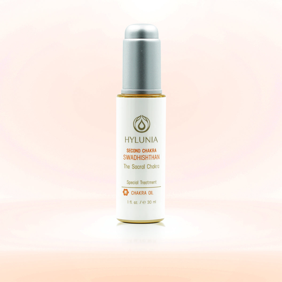 The second chakra is called Swadhisthana or Sacral chakra. It is located approximately four inches below the navel. This oil is a blend of Patchouli oil, Sesame oil and Hyaluronic acid to help heal and hydrate the skin.